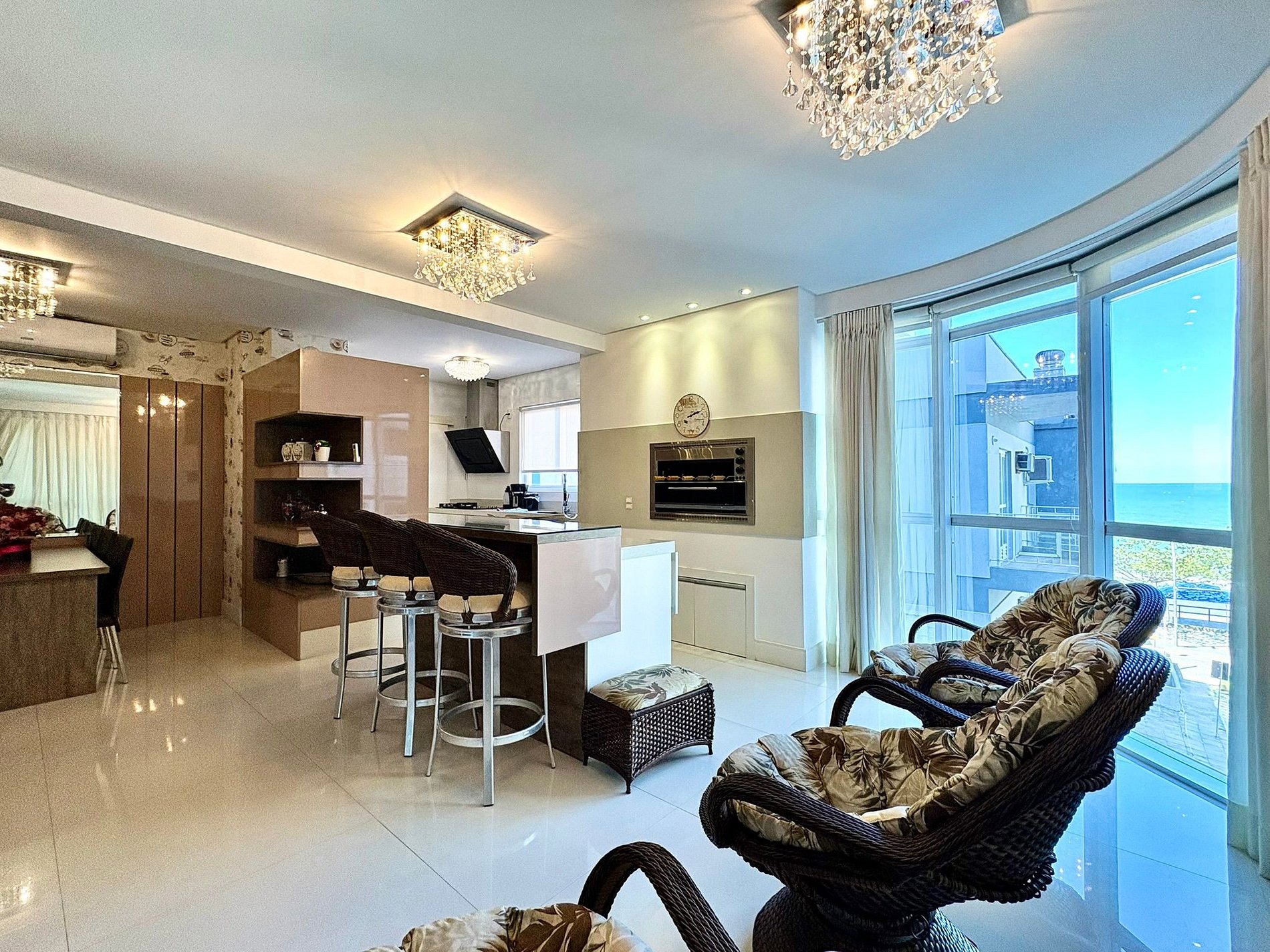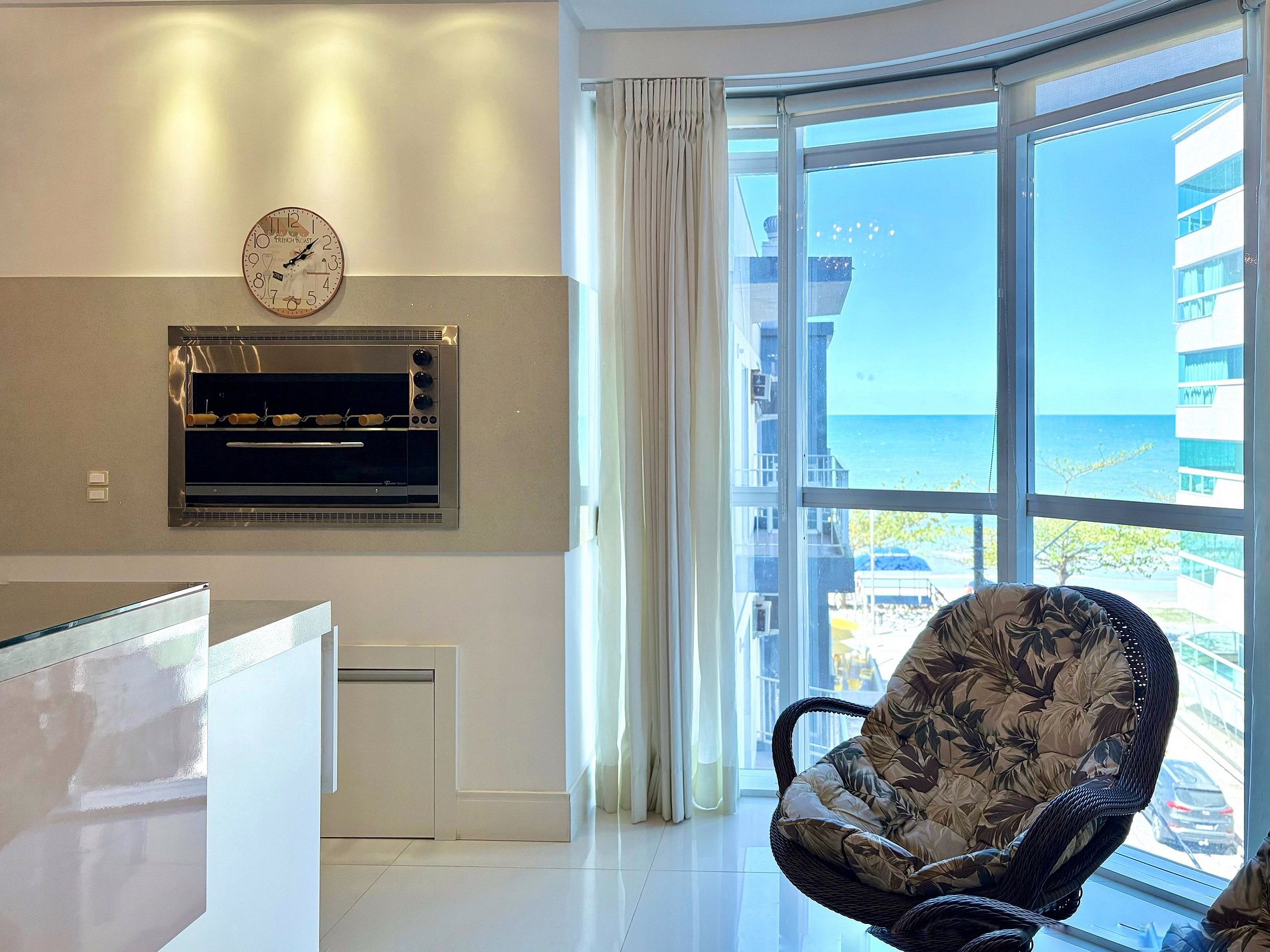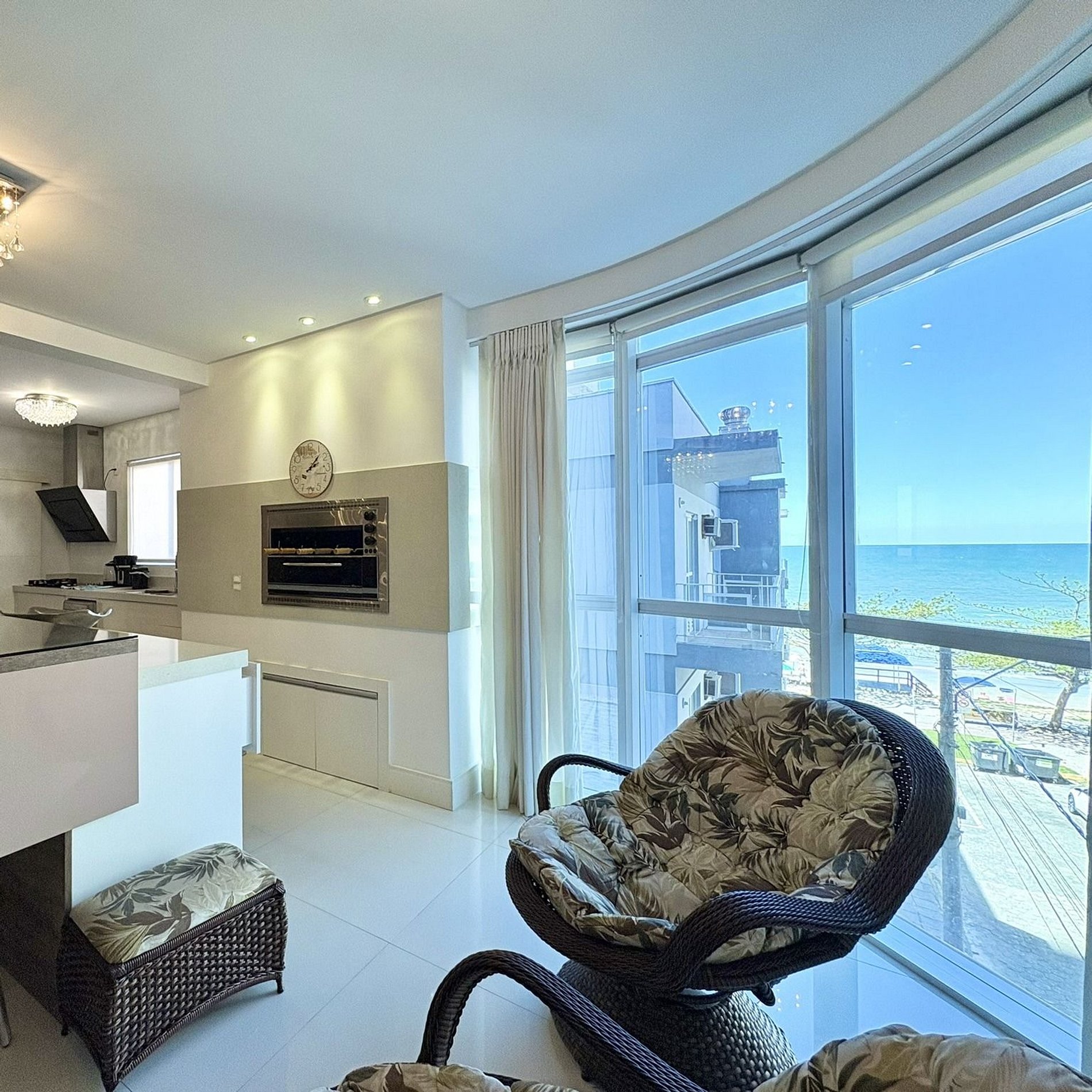 A área social integra sala, contando com cozinha completa equipada com eletrodomésticos de última geração, churrasqueira a gás interna e área gourmet externa com churrasqueira a carvão, ideal para reunir a família e aproveitar bons momentos. O apartamento ainda possui terraço amplo, perfeito para crianças brincarem com segurança, além de chuveiros a gás e banheira para relaxar após a praia.